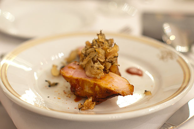 Der var mere kød i form af lækker Hindsholmgris i en rom-BBQ glasering (baseret på Diplomático Reserva Exclusiva) med sprøde jordskokkechips på toppen. Her kunne man ved bordet selv forsyne sig med en lækker gang vilde svampe i flødesauce som tilbehør.